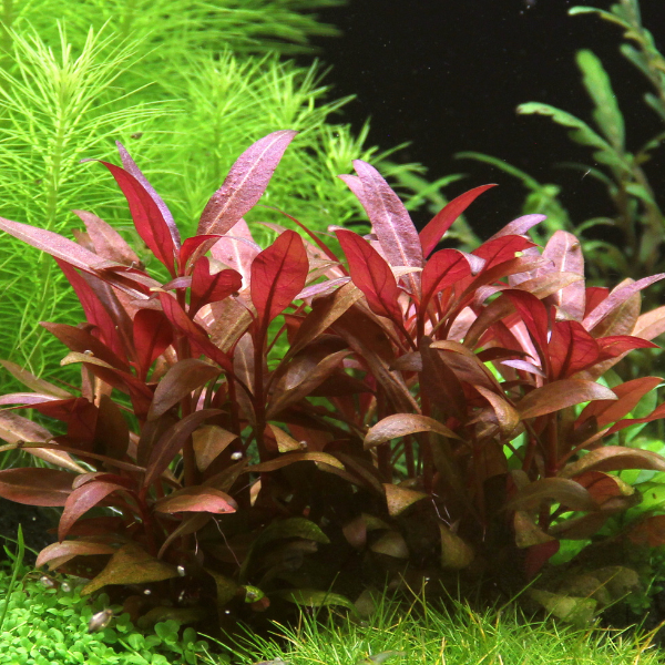 This new variety, Dennerle Alternanthere reineckii Mini, only came onto the market a few years ago, and makes a colorful foreground highlight. In emersed hydroponic systems, its growth is very similar to other Alternanthera varieties. The compact, miniature format only develops under water. This little beauty comes highly recommended as a splash of color for Nano Cubes. For a strong color contrast, combine with a carpet of light green Hemianthus. Note that a very light, well-lit location is essential.