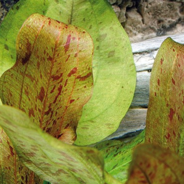 The leaf shape of the Echinodoru ‘Spotted Harbich’ is similar to that of the pure ‘Green Harbich’ variety. However, this variant has a very pretty red spotted pattern. Emersed leaves are almost circular and only seen above water; in aquariums they have shorter stems and the leaf shape is much more elongated. The olivegreen leaves with their reddish-brown pattern often have wavy edges. The fact that it grows to 25 cm makes this variety very suitable for smaller aquariums. As with all our Dschungelstars, this is a very easy plant to grow.