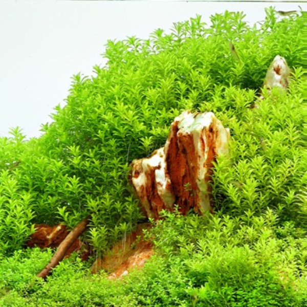 Home for these fragile aquarium plants is the east coast of North America. This variety of Hemianthus grows on rocky or muddy substrate at the mouths of rivers. Its loosely upright growth and brilliant, light green color are fresh and spring-like. A pair of sharp scissors is all you need for pruning purposes. After pruning, the plants produce a number of new side shoots and the whole stand will appear denser and more compact. Create rich contrasts by combining light green Hemianthus with red-leafed varieties, such as Alternanthera.
