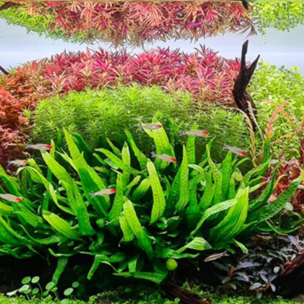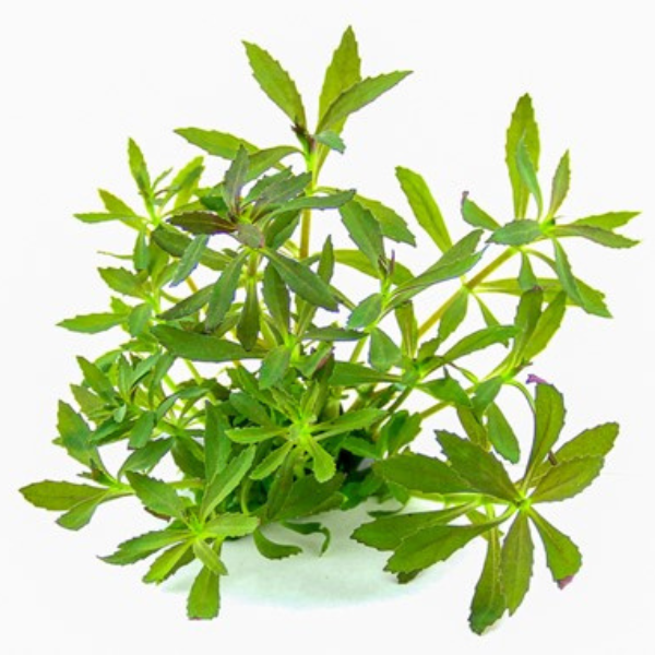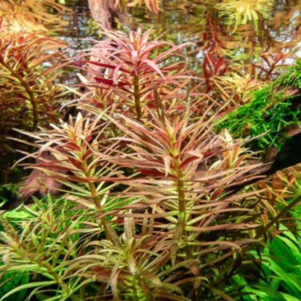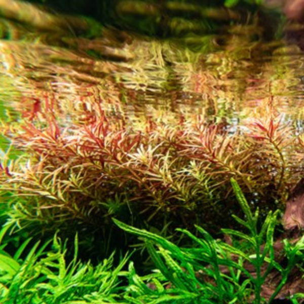 Limnophila hippuridoides in the above-water form is not particularly eye-catching with green leaves. However, under water the plant develops into a colorful beauty. Soft to medium hard water, intensive lighting and a good CO2 supply will guarantee this plant to be a highlight in the middle to background. A group with several stems is especially impressive. Unlike many other stem plants, the growth is quite moderate, so pruning can be done at longer intervals. Bright green species growing nearby increase the color contrast.