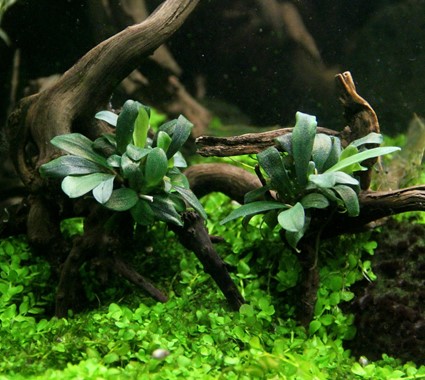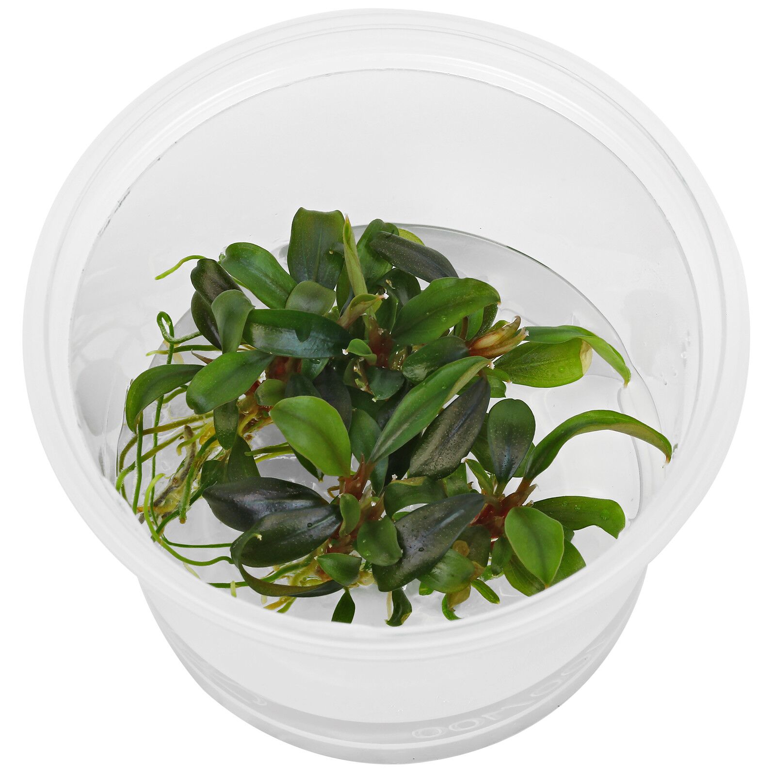 This Bucephalandra was one of the first imported varieties from West Kalimantan, the Indonesian part of Borneo. The variety name refers to its origin in the Serimbu region. According to more recent knowledge, this beauty probably belongs to the Bucephalandra pygmaea group. Its leaves are narrowly elliptical; depending on the lighting, their color can vary from dark olive green to reddish brown. Like the genus Anubias and Cryptocoryne, Bucephalandra belong to the arum family. Every now and then, you can observe their typical inflorescences under water.