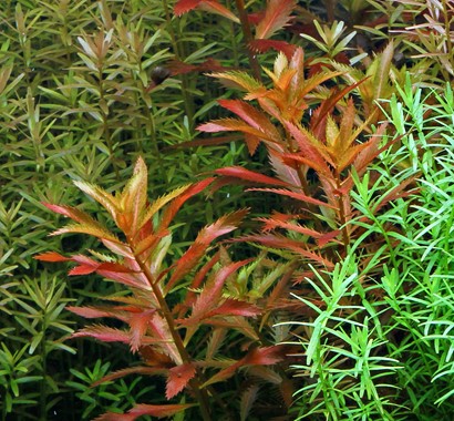 In the emerged stage, this stem plant originating from Cuba, looks rather unimpressive with its simple green leaves. After a period of acclimatisation under water, the plant will gradually reveal its feathery and magnificently colorised underwater leaves. Proserpinaca grows slowly and is recommended for Nano Cubes. The stalks do not branch out too much, which is why the head cuttings should be put back on the same spot. The lower, no longer nice-looking part of the stalk should be removed.